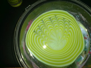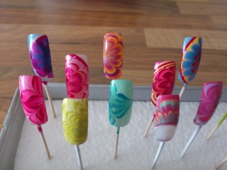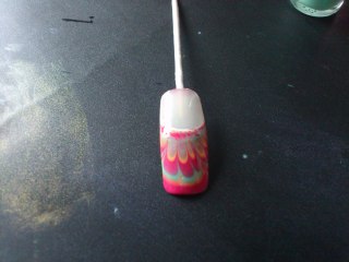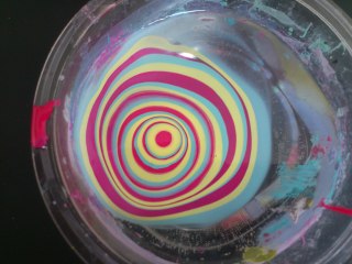 Träufele nun verschiedene Nagellackfarben in die Mitte des Glases/Bechers.
